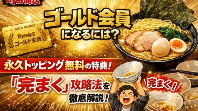 横浜家系ラーメン「町田商店」のゴールド会員になりたい方必見!ゴールドカードを手に入れる条件、トッピング永久無料などの豪華特典、そして最短で会員ランクを上げるための「完まく」アプリ活用術を詳しく解説します。家系ラーメンファンなら知っておきたい情報が満載です。