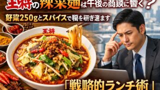 醤油ラーメン 王将の辣菜麺は午後の商談に響く?野菜250gとスパイスで脳を研ぎ澄ます「戦略的ランチ術」 執筆:ケンタ/外食戦略アナリスト元大手飲食チェーンの商品開発担当。現在は「ビジネスパフォーマンスを最大化する外食術」を提唱するアナリストとして活動。餃子の王将利用歴は20年を超え、全メニューの成分と満足度の相関を独自にデータベース化している... 2026.04.10 醤油ラーメン