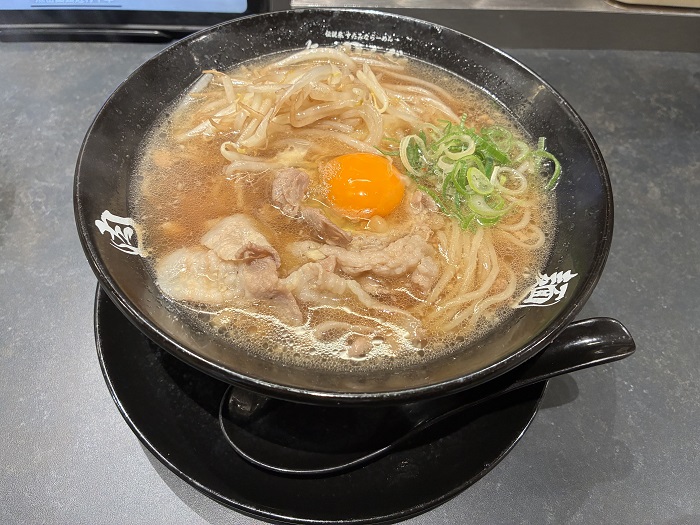 濃い琥珀色のスープに、秘伝のタレで炒められたたっぷりの豚バラ肉、そして中央に鎮座する卵黄。